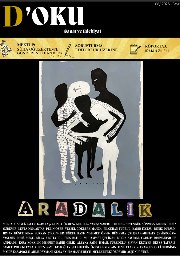 D’oku Sanat ve Edebiyat dergisinin üçüncü sayısı yayımlandı. Edebiyat ve sanat, doğaları gereği kesin sınırların değil; belirsizliklerin, geçişlerin ve eşiklerin alanıdır.  düşünceden yola çıkarak, D’oku Sanat ve Edebiyat dergisi üçüncü sayısında okurlarını “aradalık” kavramı üzerine düşünmeye davet ediyor. Şiirden öyküye, denemeden incelemeye; sinemadan plastik sanatlara uzanan geniş bir yelpazede bu çok katmanlı kavramı yeniden tartışmaya açıyoruz.