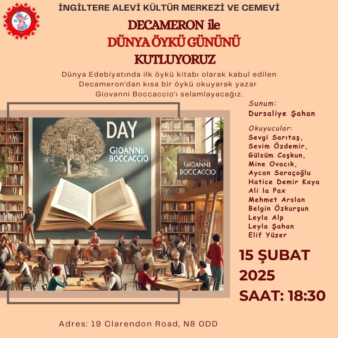İngiltere Alevi Kültür Merkezi ve Cemevi’nin düzenlediği etkinlik projesinde dünya edebiyatındaki ilk öykü kitabı olarak kabul edilen Yazar Giovanni Boccaccio’nın Decameron isimli öyküleri anlatılacak.