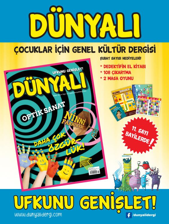 Dünyalı’nın Şubat sayısında yine güzel hediyeler var: Kısa sürede acar bir dedektife dönüşebilmeniz için uzman casuslar tarafından hazırlanan Dedektiflik ve Casusluk Rehberi, birbirinden renkli 108 adet çıkartma ve yarıyıl tatilinize neşe katacak iki eğlenceli masa oyunu.