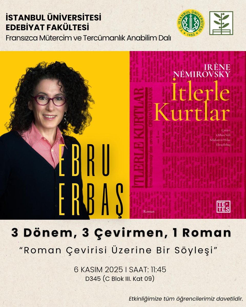 Fransızca Mütercim ve Tercümanlık Anabilim Dalı olarak 6 Kasım 2025 tarihinde saat 11:45’de D345 no’lu sınıfta çevirmen Ebru Erbaş ile “3 Dönem, 3 Çevirmen, 1 Roman: Roman Çevirisi Üzerine Bir Söyleşi” konulu söyleşi gerçekleştirilecektir.