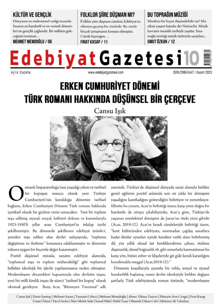 Genel Yayın Yönetmenliğini Yücel Aydın’ın yaptığı Edebiyat Gazetesi’nin manşetinde Cansu Işık’ın Erken Cumhuriyet Dönemi Türk Romanı Hakkında Düşünsel Bir Çerçeve başlıklı yazısı yer alıyor. Kitap tanıtım bölümünde Mavi Melek Sulu, geçtiğimiz günlerde raflardaki yerini alan Sesini Arayan Irmak isimli kitabı değerlendirdi.