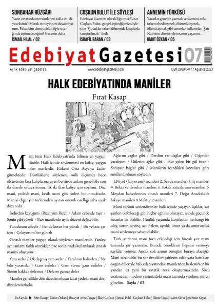 Genel Yayın Yönetmenliğini Gülseren Baran’ın yaptığı Edebiyat Gazetesi’nin manşetinde Fırat Kasap’ın Halk Edebiyatında Maniler başlıklı yazısı yer alıyor. Söyleşi bölümünde, Eğitimci-Yazar Coşkun Bulut ile çocuk edebiyatı hakkında konuşuldu.