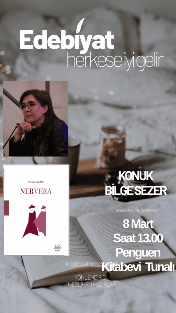 Edebiyat Herkese İyi Gelir Kitap Kulübü’nün konuğu Bilge Sezer  8 Mart Dünya Emekçi Kadınlar Günü’nde Yazar Bilge Sezer ile Ner Vera kitabını konuşmak üzere bir araya gelecek. Ankara/Tunalı Penguen Kitabevi’nde saat 13.00’deki söyleşinin yönlendiriciliğini Neslihan Hazırlar yapacak.