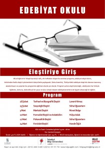 İstanbul Bilgi Üniversitesi bünyesinde devam eden Edebiyat Okulu bünyesinde “Eleştiriye Giriş” seminerleri başlıyor. Eğitmenler Murat Belge, Levent Yılmaz, Süha Oğuzertem, Hande Öğüt ve Hülya Adak.
