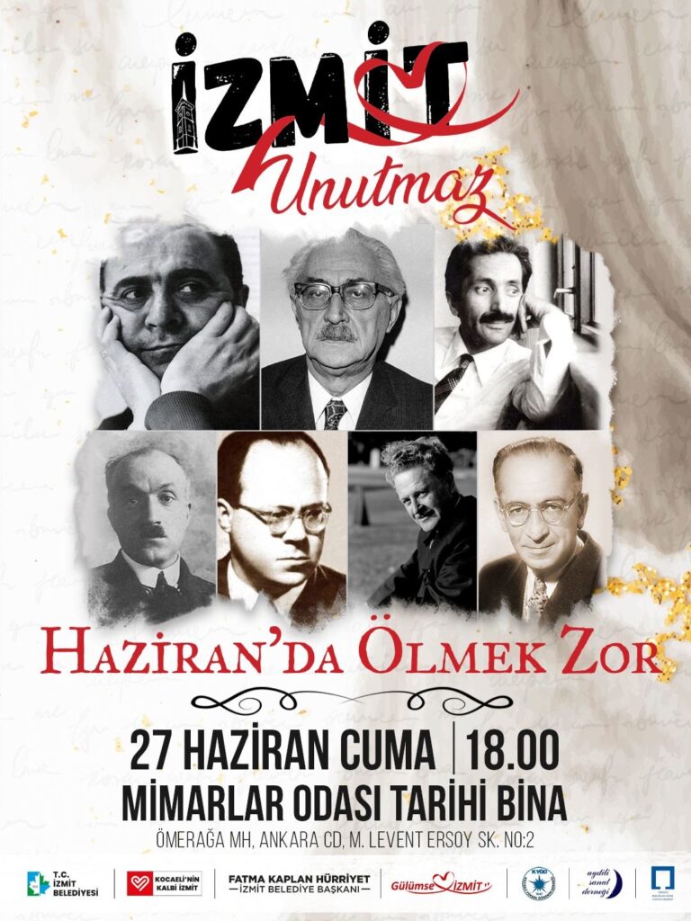 İzmit Belediyesi, haziran ayında hayatını kaybeden edebiyat dünyasının unutulmaz isimlerini “Haziran’da Ölmek Zor” adlı özel anma gecesiyle anacak. 27 Haziran Cuma akşamı saat 18.00’de Mimarlar Odası Tarihi Bina’da düzenlenecek etkinlikte, Nazım Hikmet, Ahmed Arif, Cahit Zarifoğlu, Peyami Safa, Cemil Meriç, Ahmet Muhip Dıranas ve Ahmet Haşim gibi haziran ayında aramızdan ayrılan ustalar anılacak.
