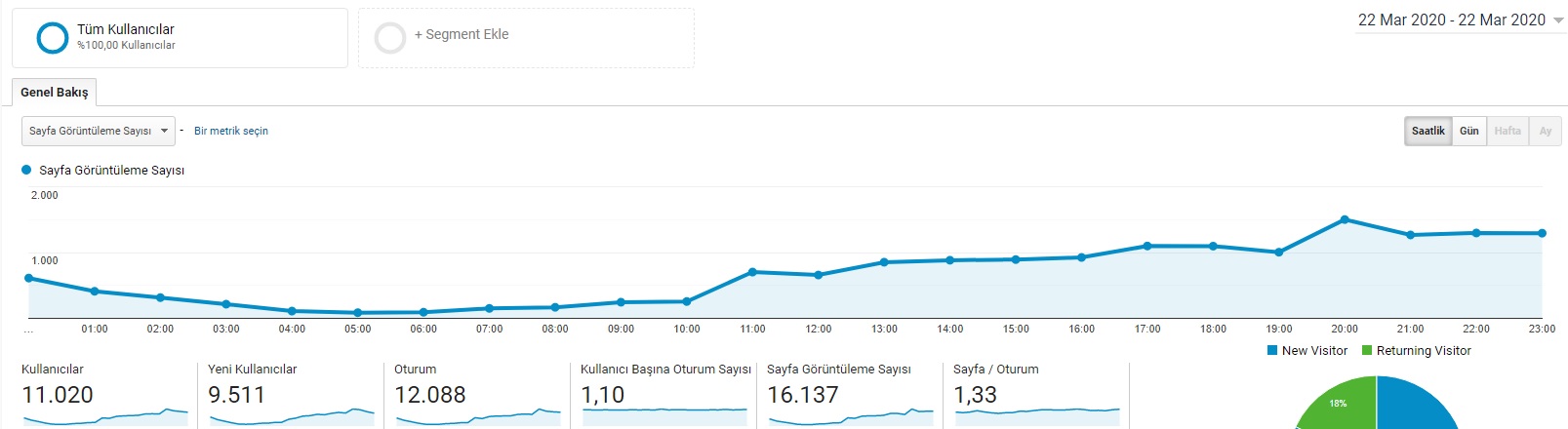 Koronavirüs salgını nedeniyle eve kapandığımız şu günlerde ziyaretçi sayımızın ciddi bir oranda artığını belirtmeliyiz. Sadece 1 günde (22 Mart Pazar günü) Edebiyat Haber’i 11.020 farklı kullanıcı ziyaret etti ve bu ziyaretler sonunda 16.137 sayfa görüntülendi. Umarız ve dileriz bu salgının yayılması kısa sürede kontrol altına alınır. Edebiyat Haber ailesi olarak işimizin başındayız; siz değerli okurlarımıza nitelikli içerikler üretmeyi sürdürüyoruz, sürdüreceğiz.