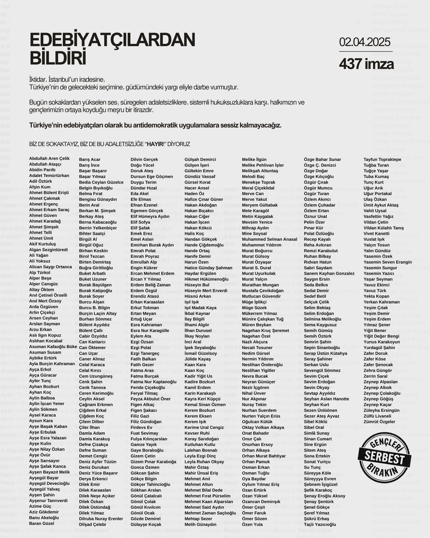 Edebiyatçılardan 437 imzalı bildiri Nisan 3, 2025Nisan 2, 2025 yazar edebiyathaber Türkiye’nin önde gelen edebiyatçıları, antidemokratik uygulamalara sessiz kalmayacaklarını 437 imzalı bir bildiriyle kamuoyuna duyurdu. edebiyathaber.net (2 Nisan 2025) Nejat İşler'in başrolünde yer aldığı üçlemenin ikinci filmi Kötü Adamın 10 Günü, 18 Ağustos'ta Netfl...Black Mirror'ın 6. sezon fragmanı yayınlandıGirdiği evde kitap okumaya dalınca yakayı ele veren hırsızın büyülendiği kitap hangisiydi?Şair Yavuz Bülent Bâkiler hayatını kaybettiŞair Şükrü Erbaş, Bandırma’da kitapseverlerle buluştuNetflix'in Yüzyıllık Yalnızlık dizisinden fragman yayınlandı