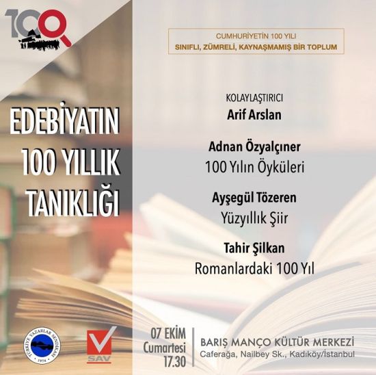 Sosyal Araştırmalar Vakfı’nın (SAV) düzenlediği “Edebiyatın 100 Yıllık Tanıklığı” semineri 7 Ekim Cumartesi 17.30’da Barış Manço Kültür Merkezi’nde yapılacak.