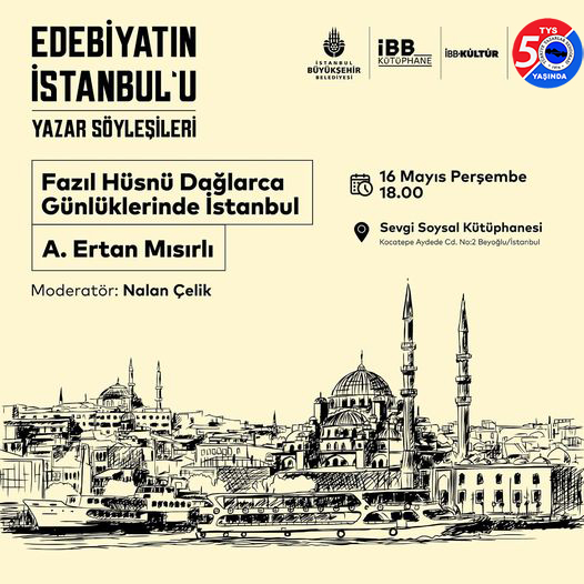 Türkiye Yazarlar Sendikası (TYS) ile İstanbul Büyükşehir Belediye Başkanlığı Kültür Dairesi Başkanlığı’nın işbirliği ile Sevgi Soysal Kütüphanesi’nde düzenlenen “Edebiyatın İstanbul’u–Yazar Söyleşileri“ devam ediyor. 16 Mayıs 2024 Perşembe günü saat 18.00’de “Edebiyatın İstanbul’u” söyleşisinde Nalan Çelik moderatörlüğünde bu kez Fazıl Hüsnü Dağlarca Günlüğü kitabının yazarı A. Ertan Mısırlı konuk olacak.