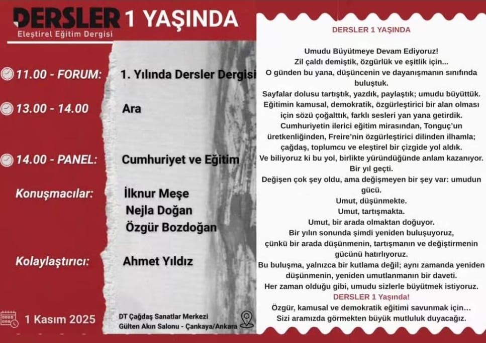 Eleştirel Eğitim Dergisi “Dersler”, birinci yaşını 1 Kasım’da kutluyor Ekim 31, 2025 yazar edebiyathaber Eleştirel Eğitim Dergisi Dersler, birinci yaşını etkinlikle kutluyor. Etkinlik 1 Kasım’da Ankara Çağdaş Sanatlar’da Gülten Akın Salonu’nda saat 11.00’de başlayacak. Serra Yılmaz, İtalya’da Minerva- Anna Maria Mammoliti Ödülü’ne layık görüldüLeonardo Da Vinci’nin dünyasına Emirgan’da yolculukUluslararası Mitoloji Film Festivali 21 Aralık’ta başlıyorNazım Hikmet Eyüpsultan'da anıldı14 Şubat Dünya Öykü Günü İnisiyatifi yola çıkmaya hazırKadıköy Sineması Müzik Günleri, 23-24-25 Mayıs’ta