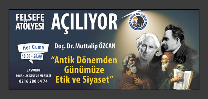 Kartal Belediyesi tarafından düzenlenen “Felsefe Atölyesi” kayıtları başladı. “Antik Dönemden Günümüze Etik ve Siyaset” konusunun ele alınacağı atölye, Doç. Dr. Muttalip Özcan’ın eğitmenliğinde, 17 Kasım 2017 Cuma gününden itibaren her Cuma, 18.00-20.00 saatleri arasında Soğanlık Kültür Merkezi’nde gerçekleştirilecek.