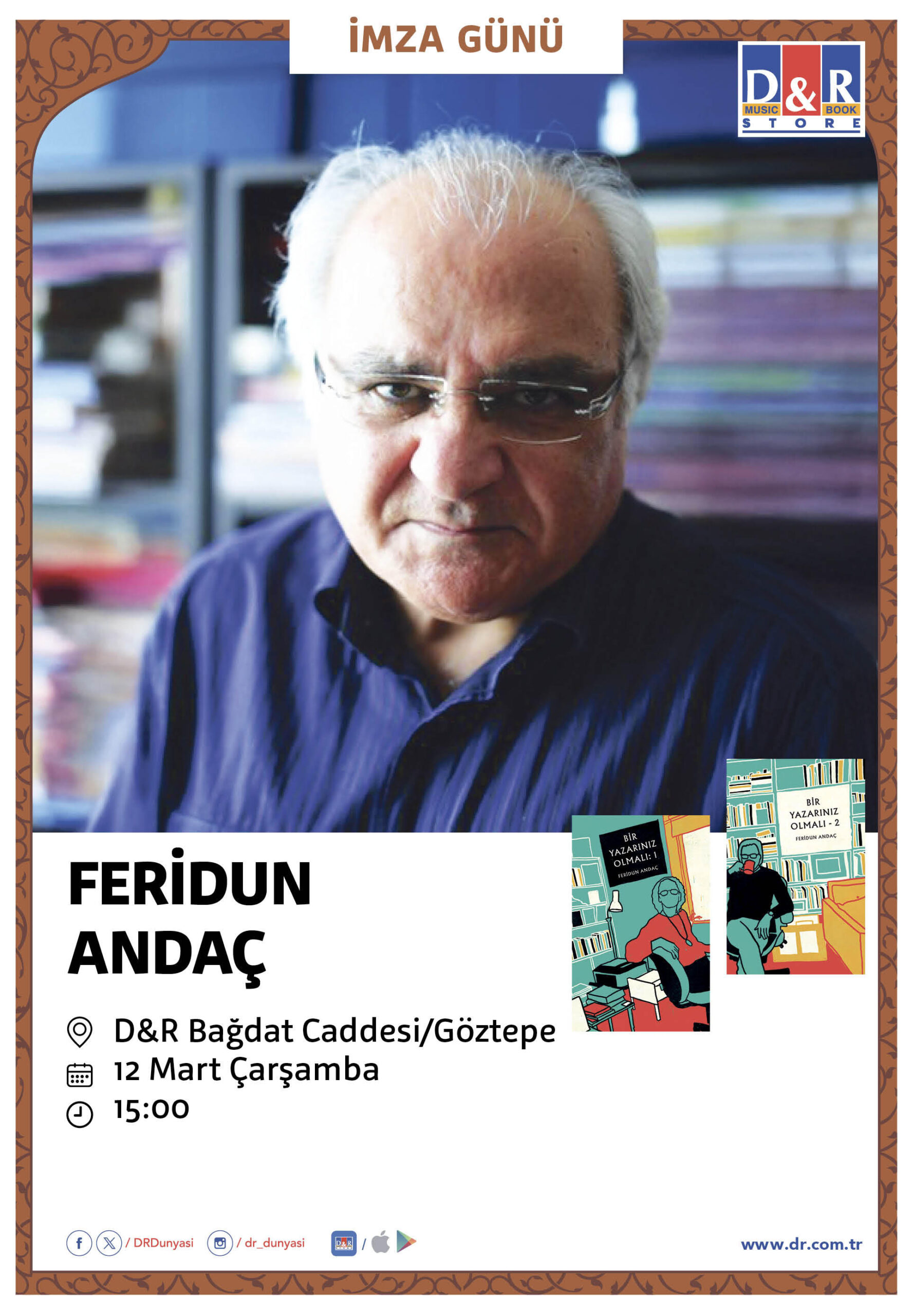 Feridun Andaç son kitabı Bir Yazarınız Olmalı 1 &2 ile 12 Mart’ta İstanbul, Göztepe, Bağdat Caddesi’ndeki D&R’da okurlarıyla buluşuyor. Etkinliğin başlama saati 15.00.