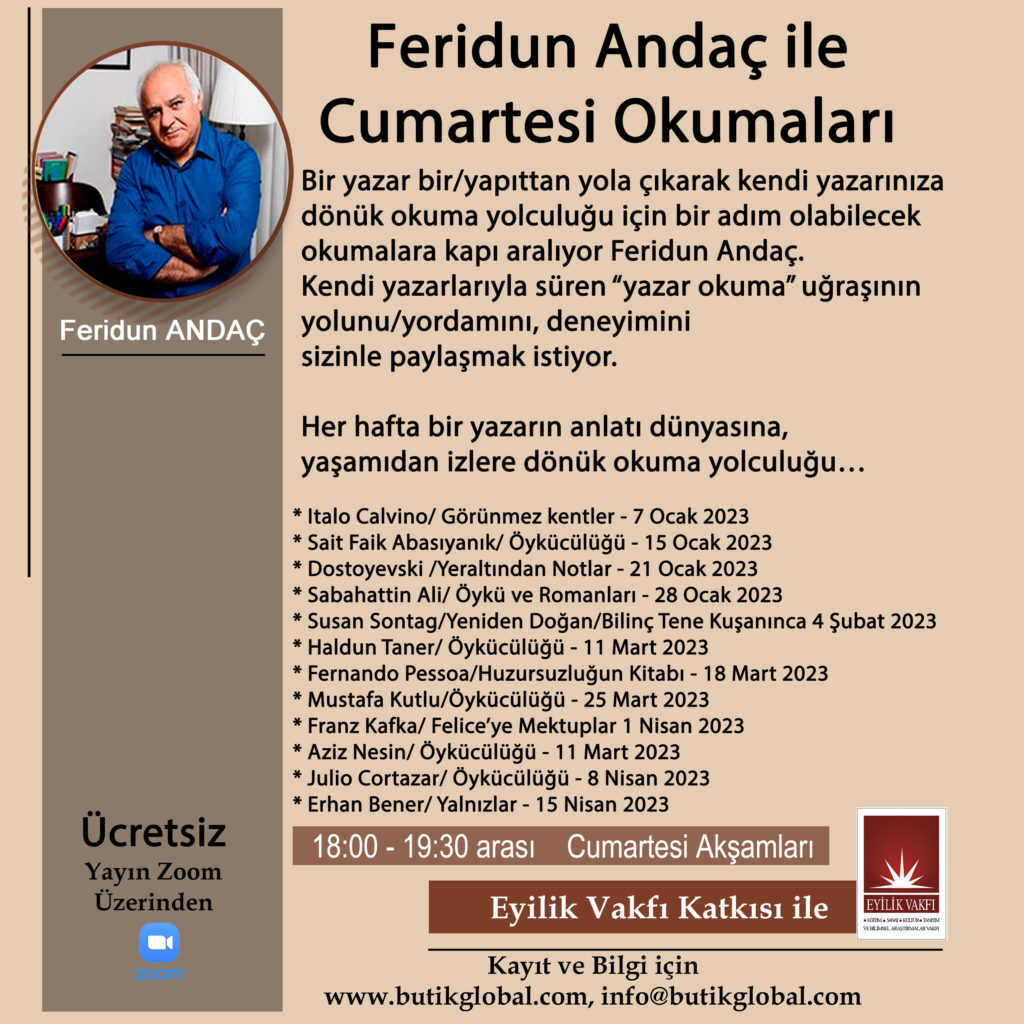 Feridun Andaç ile Cumartesi Okuma Akşamları, 7 Ocak-15 Nisan 2023 tarihleri arasında ücretsiz olarak Butik Global Online tarafından düzenleniyor.