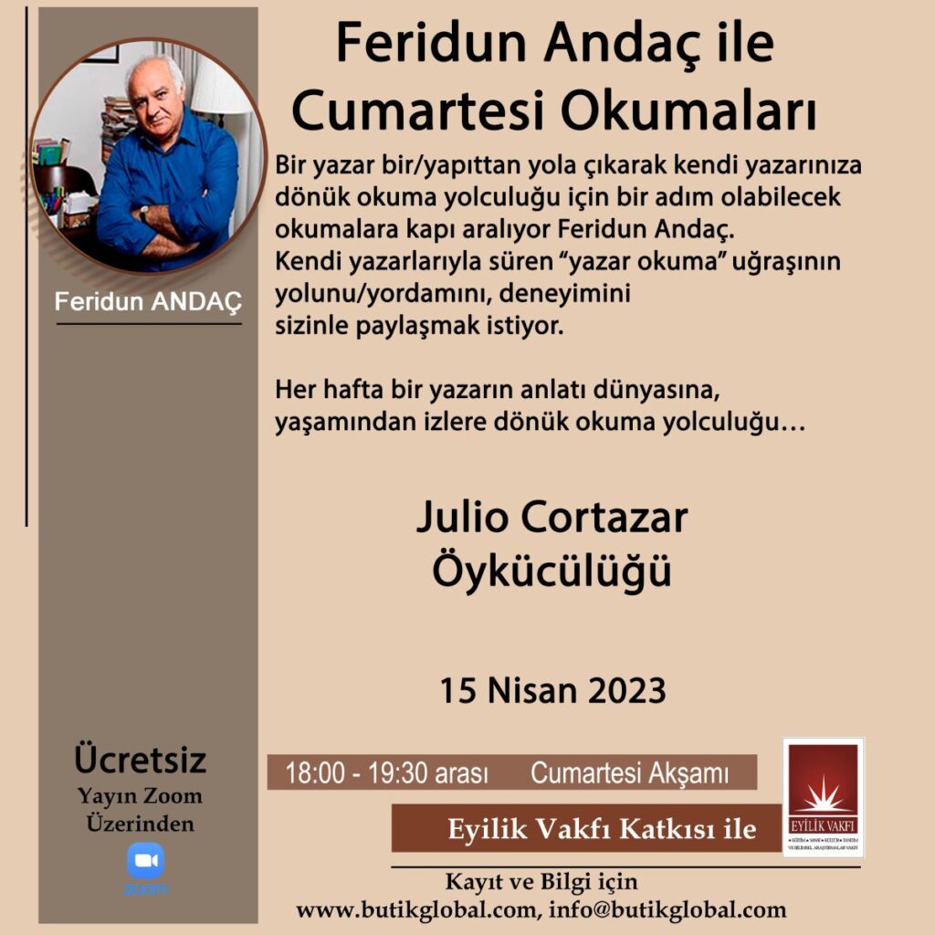 Butik Global Online’ın düzenlediği Cumartesi Okumaları kapsamındaki “Feridun Andaç ile Julio Cortazar Öykücülüğü” çevrimiçi etkinliği 15 Nisan’da ücretsiz olarak yapılacak.