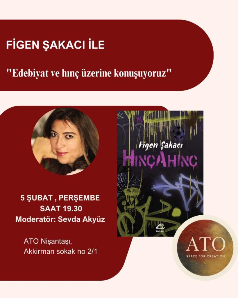 Figen Şakacı 5 Şubat’ta son romanı HınçAhınç okurlarıyla buluşuyor. Etkinlik ATO Nişantaşı’nda, saat 19.00’da Sevda Akyüz moderatörlüğünde gerçekleşecek.