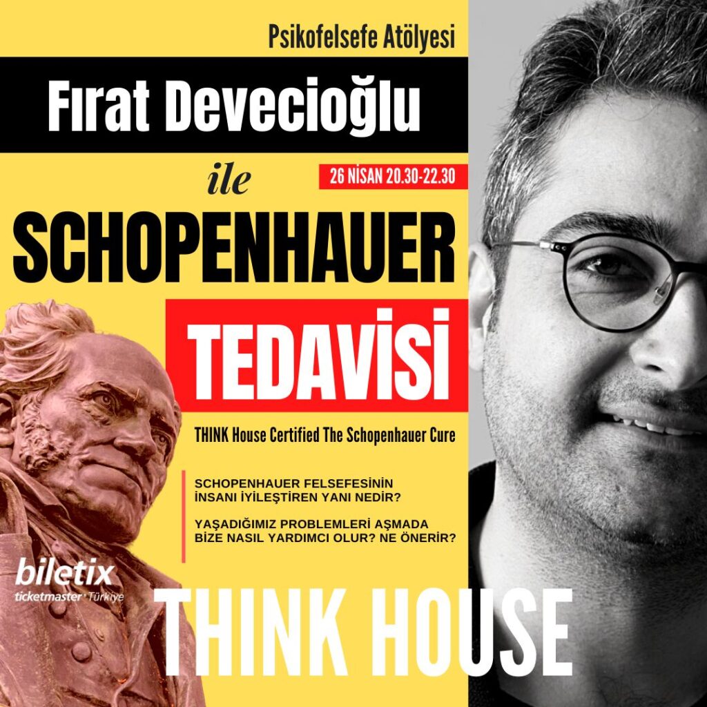 26 Nisan 2023 Çarşamba akşamı 20.30-22.30 saatleri arasında THINK House’ta düzenlenecek Psikofelsefe Atölyesi: Fırat Devecioğlu ile Schopenhauer Tedavisi’ne hem fiziki hem de çevrimiçi ortamda katılım için biletler Biletix’ten temin edilebilir.