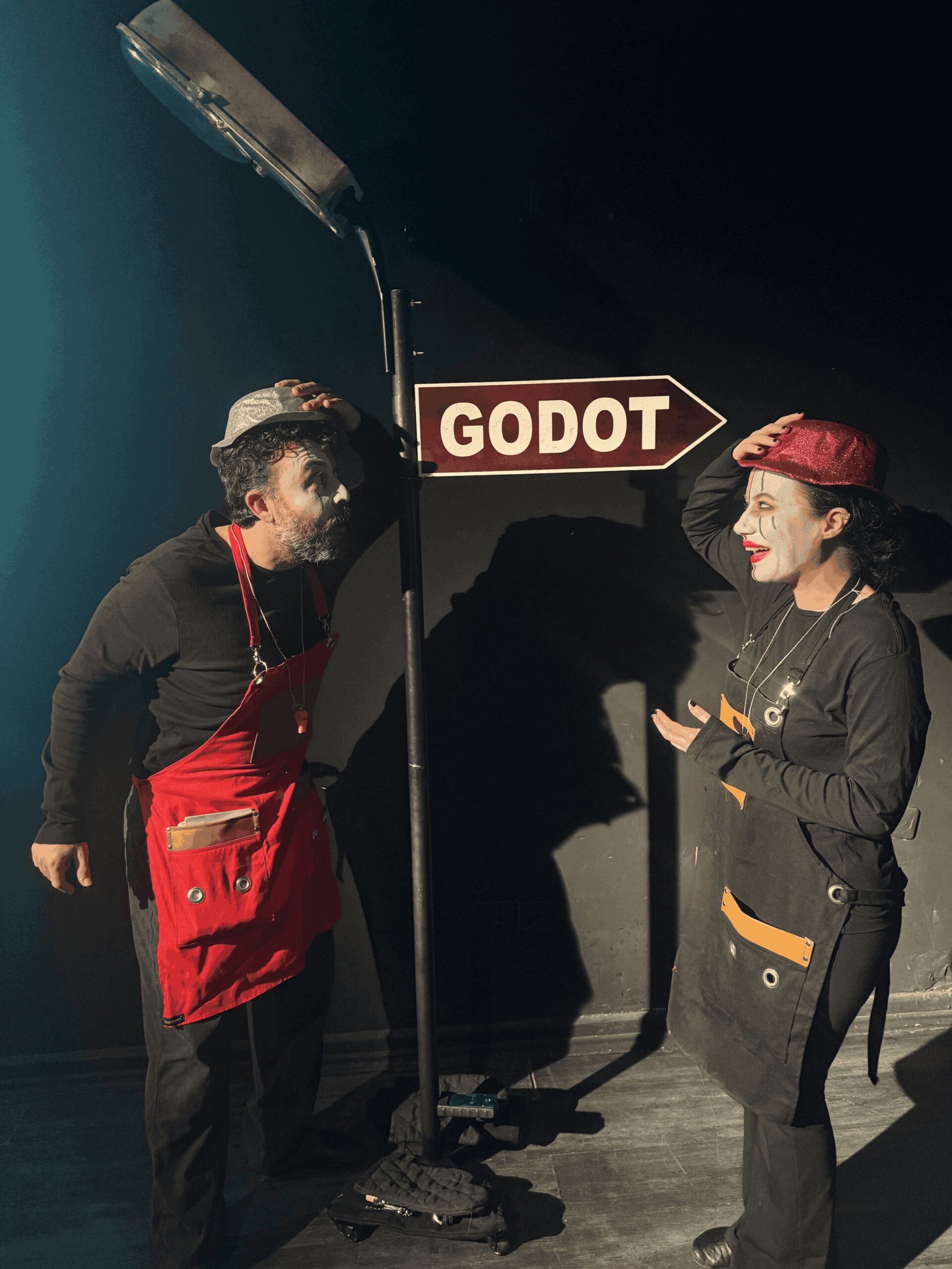 Samuel Beckett’in Godot’yu Beklerken oyunundan hareketle geliştirilen Godot’yu Beklemezken, sahnede iki clown oyuncunun hiçbir otoriteye bağlı kalmadan kendi oyunlarını kurmaya giriştiği, doğaçlama ve absürd mizahın iç içe geçtiği çok katmanlı bir performans sunuyor. Oyuncular, eski sahne eşyalarından kültürel anlatılara, anımsanan tiratlardan yeni metin parçalarına uzanan geniş bir malzeme havuzuyla kendi sahne evrenlerini adım adım inşa ederken; “beklemek mi, beklememek mi?” sorusunu hem kişisel hem toplumsal bir bağlamda yeniden ele alıyor.