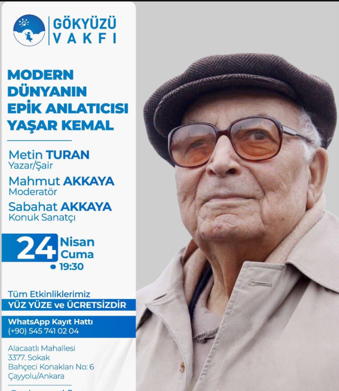 Gökyüzü Vakfı’nda düzenlenecek söyleşi, edebiyat ve kültür dünyasına ilgi duyanlar için önemli bir buluşma niteliği taşıyor. Söyleşi ve müzik dinletisini bir araya getiren etkinlik, katılımcılara Yaşar Kemal’in edebi mirasını çok yönlü biçimde değerlendirme imkânı sunacak.