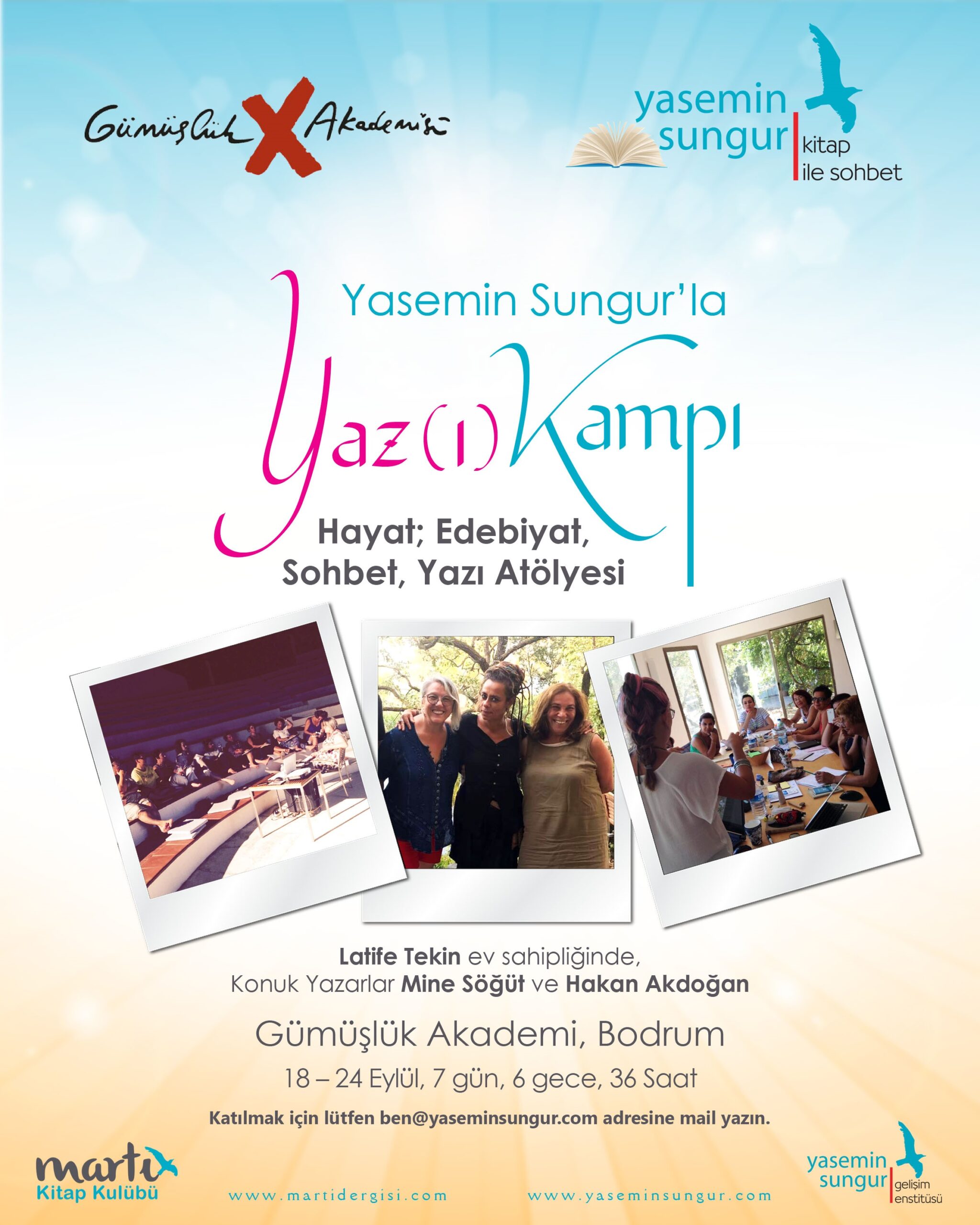 İkinci kez düzenlenen kampta, yazı atölyesinin yanı sıra, söyleşiler ve sürpriz konuklar da yer alacak. “Yaz(ı) Kampı” 7 gün 6 gece 36 saat sürecek. Yasemin Sungur böyle bir kamp düzenlemesinin nedenlerini şu şekilde açıklıyor: “Hayat, edebiyat, sohbet, yazı atölyesi deneyimi yaşayacağız hep birlikte. Edebiyatın gücünü, keyfini hep yanımızda hissedecek, hayatımızın adımlarını konuşurken okumanın, okuduklarımız hakkında konuşmanın ve yazmanın sihrini de hissedeceğiz. Kısacası atölye süresince duyusal, düşünsel, duygusal, görsel farkındalık ile kelimelerimiz buluşacak.” Atölye; hayatı edebiyatla buluşturmak, yaratıcı bir okur olmak, yazılarıyla iz bırakmak, hikaye yazmak ya da blog sahibi olmak isteyenlere farklı bir deneyim yaşatacak. Atölyenin bu seneki konuk konuşmacı yazarları Latife Tekin, Mine Söğüt ve Hakan Akdoğan.