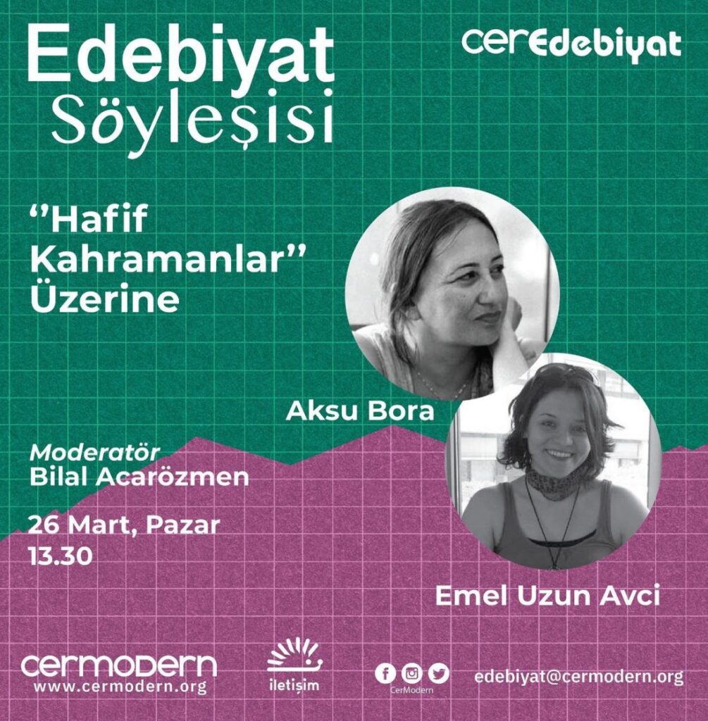 Moderatörlüğünü Bilal Acarözmen’in yapacağı, Aksu Bora ve Emel Uzun-Avci ile “Hafif Kahramanlar” Üzerine başlıklı söyleşi, 26 Mart Pazar günü 13.30’da, CerModern’de düzenleniyor.