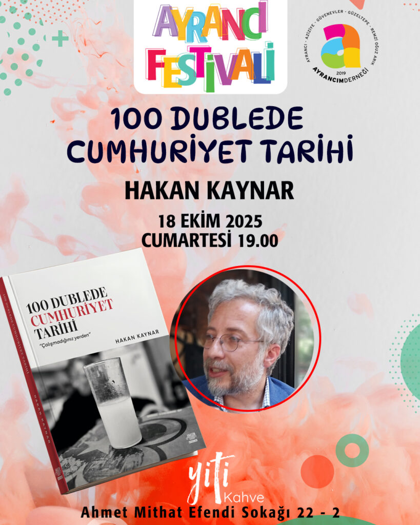 Hakan Kaynar, 100 Dublede Cumhuriyet Tarihi kitabıyla, Ayrancım Festivali’nde Ekim 19, 2025Ekim 17, 2025 yazar edebiyathaber Hakan Kaynar, 100 Dublede Cumhuriyet Tarihi kitabıyla, Ayrancım Festivali’nde okurlarıyla buluşuyor. Etkinlik 18 Ekim günü saat Yiti Cafe’de saat 19.00’da başlayacak. "Bilge Karasu'yu Düşünmek" Sergisi Goethe-Institut Ankara'daAydınlardan "Barış ve Demokrasi" konferansı“1. Efeler Kitap Günleri” 29 Eylül - 8 Ekim tarihleri arasındaÖzdemir Asaf'ın gayriresmi portresiSarkis'in "Sonsuz" başlıklı kişisel sergisi Arter'de ziyarete açıldıLüleburgaz'da 21 Mart Dünya Şiir Günü'ne özel şiir etkinliği