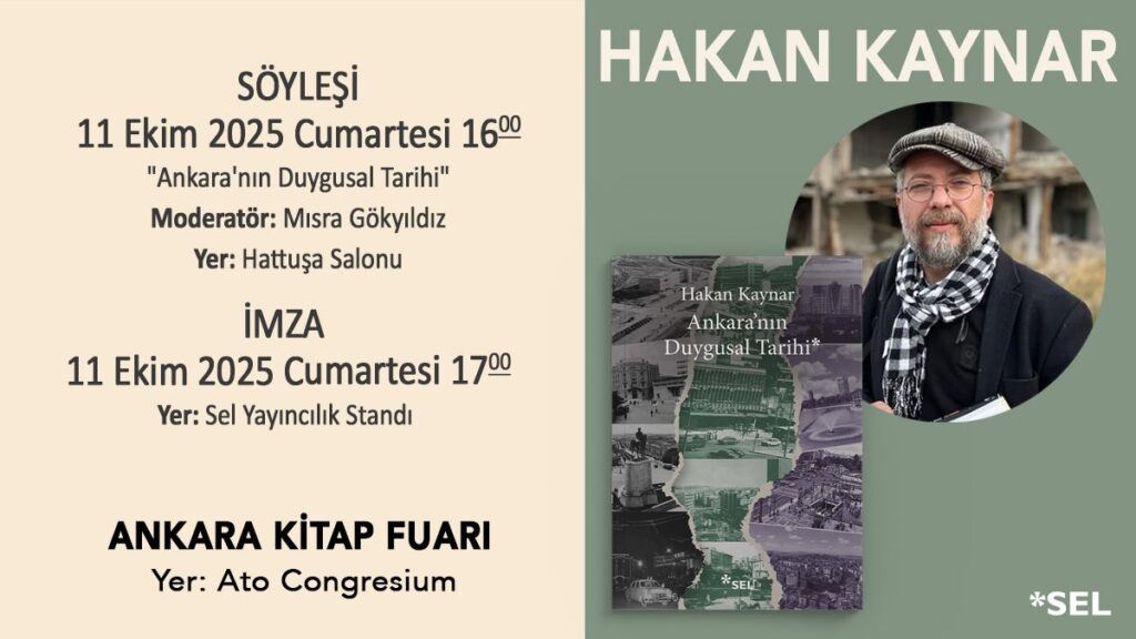 Hakan Kaynar 11 Ekim’de “Ankara’nın Duygusal Tarihi” ile okurlarıyla buluşuyor. Etkinlik 11 Ekim Cumartesi saat 16.00’da “Ankara’nın Duygusal Tarihi” üzerine Mısra Gökyıldız’la Hattuşa Salonu’nda söyleşecek.