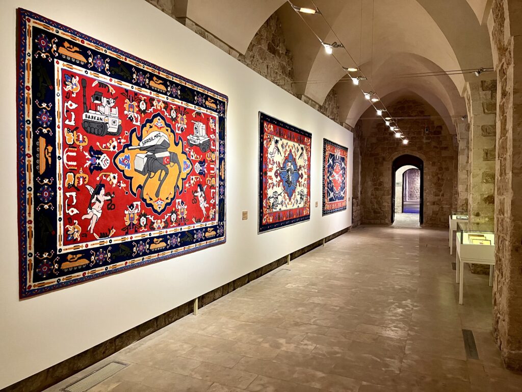 Sanatçının yakın dönemde ürettiği ve Venedik Bienali’nden Gwangju Bienali’ne, Roma Maxxi Müzesi’nden Neue Berliner Kunstverein gibi pek çok müze ve kurumda gösterilen yapıtlarının yanı sıra Afgan zanaatkârların direniş ve dayanışma sembolü olan savaş halılarından ilhamla ürettiği halı serisi ile geleneği gelecekle harmanladığı murakka çalışmaları Mardin’de ilk kez izleyicisiyle buluşuyor.
