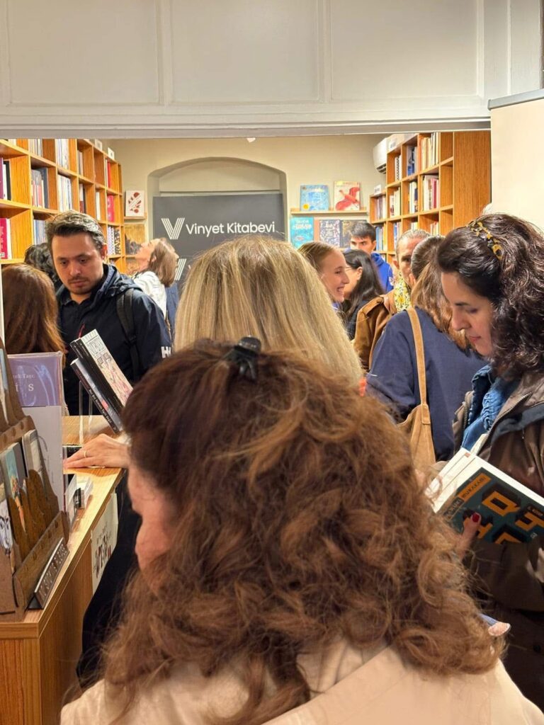 “Bağımsız kitabevi Vinyet’i desteklemek ve üniversite öğrencileri için askıya kitap bırakmak için bugün bir araya geldik. Dakikalar ilerledikçe büyüdük, sığmadık kitabevine! Okurundan çevirmenine, yazarından öğrencisine, hepimizi edebiyatın gücü birleştirdi. Hayatım boyunca unutmayacağım, kitap ve iyilikle dolu, çok güzel bir gündü.”