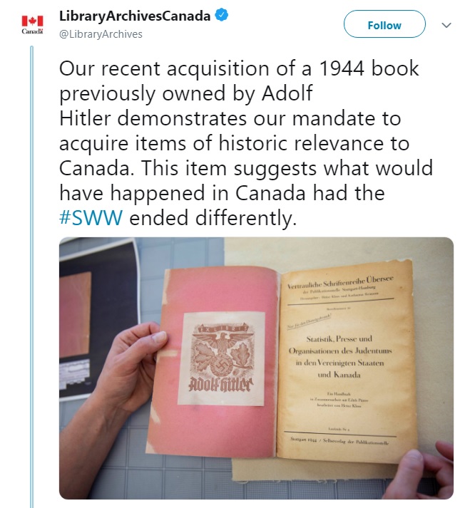 Kanada, arşivlerinde Adolf Hitler’e ait olan bir kitap bulunduğunu açıkladı. Kitabın Hitler’in Avrupa ve ABD’de yaşayan Yahudiler için yaptığı holokost planlarını ortaya çıkardığı belirtildi.