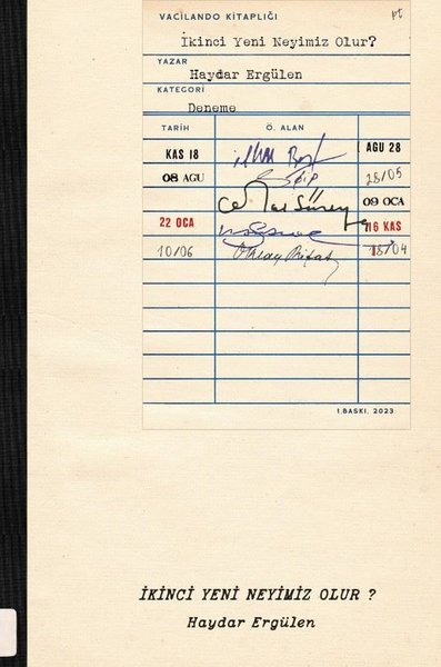 Rahmetli Adnan Benk kitapların eleştirisine kapağından başlarmış. Ben de yazının sonunda da olsa kapağa değinmek isterim. “İkinci Yeni Neyimiz Olur?”un değişik bir kapağı var. Şimdi hâlâ kullanılıyor mu bilmiyorum ama kütüphanelerdeki kitapların içinde yer alan ve okurlara ödünç verilen kitapları izlemeyi sağlayan kartların bir benzeri yapılmış kapağa. O kartlardan ödünç aldığınız kitabı daha önce kimlerin okumuş olduğunu da anlamanız mümkündü.