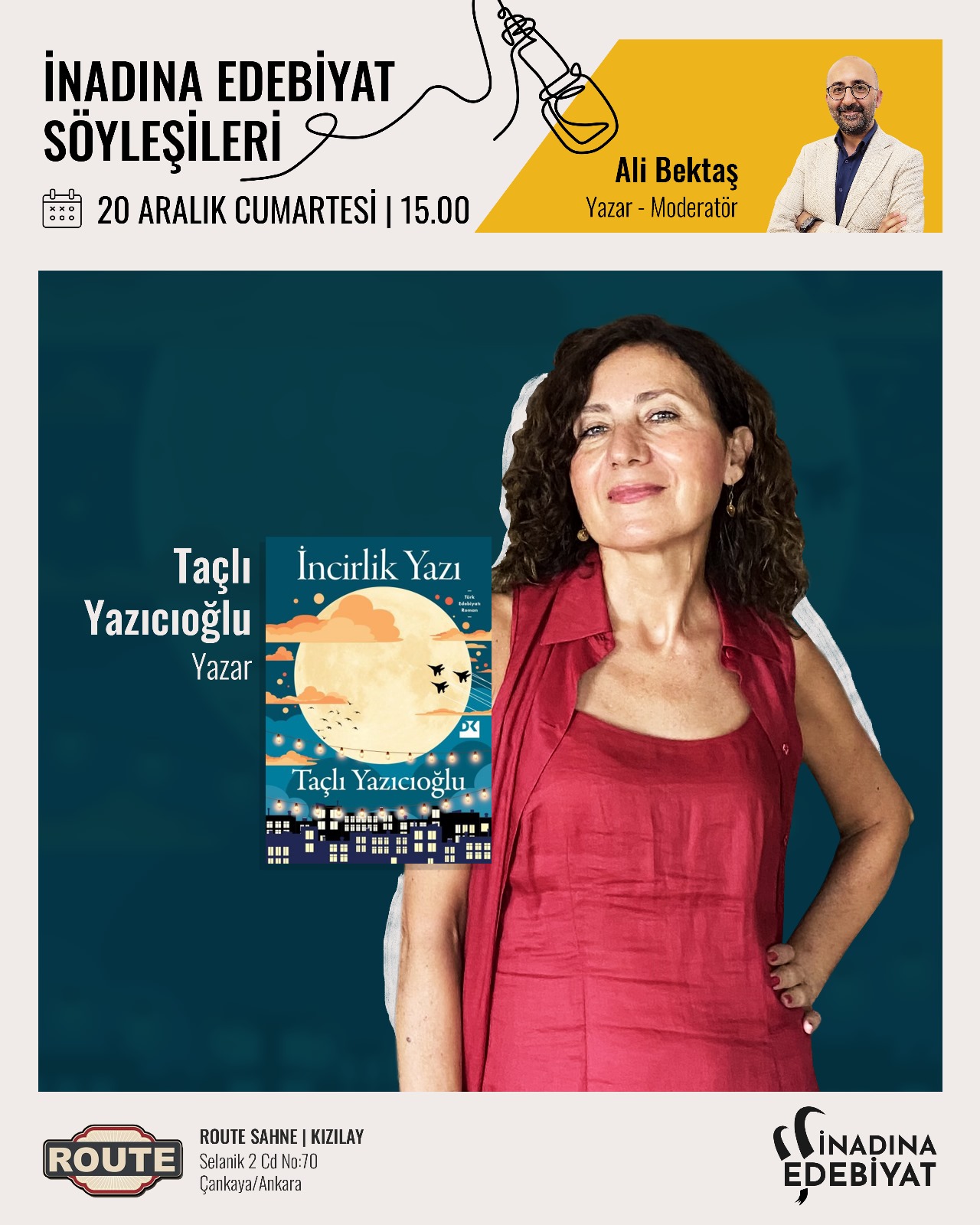 Yeni romanı “İncirlik Yazı” ile okurların beğenisini kazanan Taçlı Yazıcıoğlu İnadına Edebiyat üyeleri ve Ankaralı kitapseverlerle buluşacak. Söyleşinin moderatörlüğünü Kulüp Kurucusu ve Yazar Ali Bektaş üstlenecek.