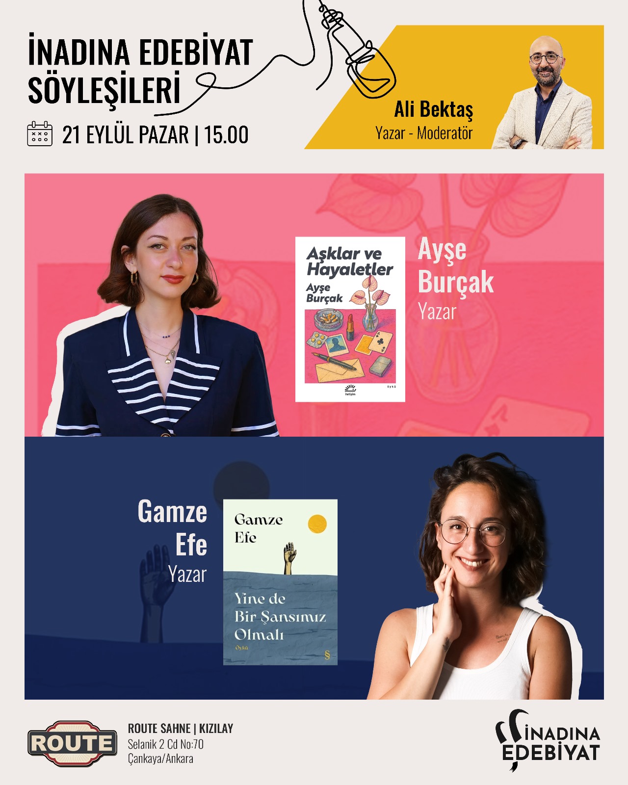 Everest Yayınları’ndan çıkan “Yine de Bir Şansımız Olmalı” adlı kitabıyla 78. Yunus Nadi Öykü Ödülünün sahibi olan Gamze Efe ve yakın zamanda İletişim Yayınları’ndan çıkan ve okurların büyük beğenisini kazanan “Aşklar ve Hayaletler” adlı kitabıyla Ayşe Burçak, “İnadına Edebiyat Söyleşileri” kapsamında 21 Eylül Pazar, saat 15.00’te Ali Bektaş moderatörlüğünde Route Sahne-Kızılay’da Ankaralı kitapseverlerle buluşuyor.