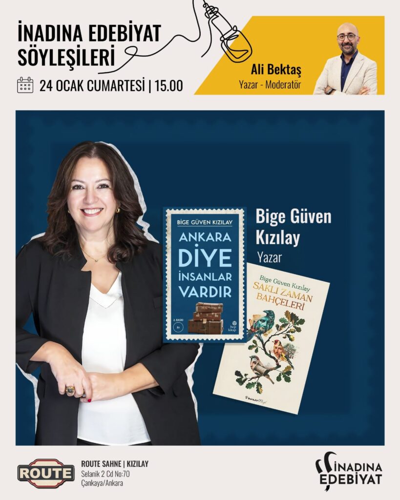 Bige Güven Kızılay, çok okunan ve çok sevilen kitabı “Ankara Diye İnsanlar Vardır” ve çiçeği burnunda romanı “Saklı Zaman Bahçeleri” ile Ankaralı kitapseverlerle buluşacak. Söyleşinin moderatörlüğünü ise İnadına Edebiyat kurucusu ve yazar Ali Bektaş üstlenecek.