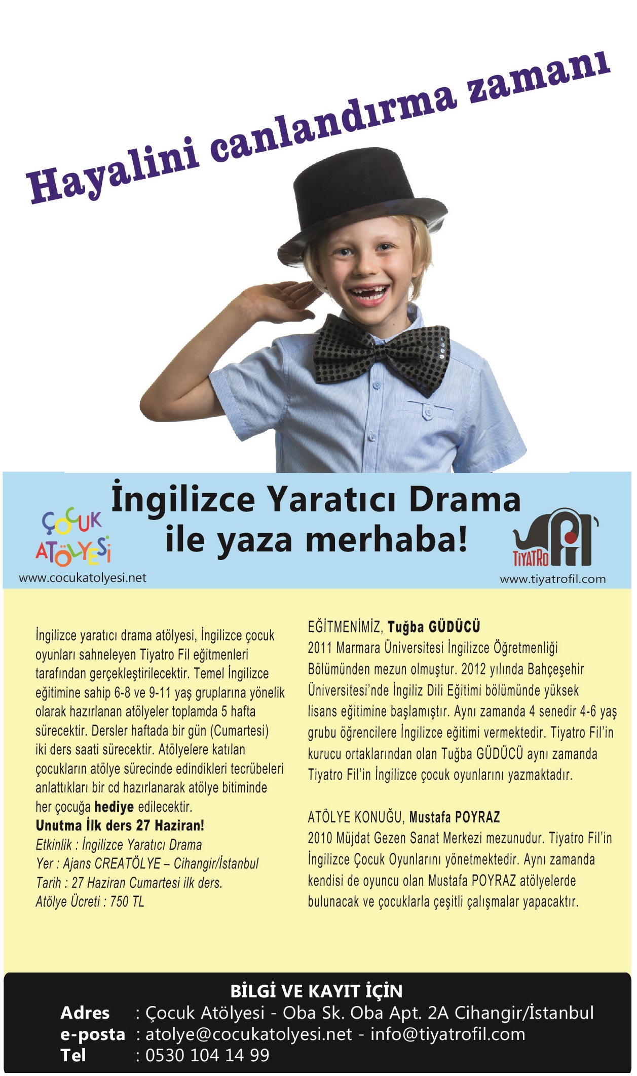 İngilizce Yaratıcı Drama Atölyesi başlıyor Haziran 5, 2015 yazar admin Çocuk Atölyesi ve Tiyatro Fil işbirliğiyle düzenlenecek İngilizce Yaratıcı Drama Atölyesi 27 Haziran’da başlıyor. edebiyathaber.net (5 Haziran 2015) Kim okuyor bu kalın kitapları? | Metin CelâlTerry Eagleton'dan "İyimser Olmayan Umut"Tarih insanın tabii unsurudur | Pelin TemurKültürel Miras ve Dijitalleşme Sempozyumu gerçekleştirildiKarantinaya alınmış odalar | Anıl Ceren AltunkanatÖykü: Kavak Kesiminden Kalan | Okan Eroğlu