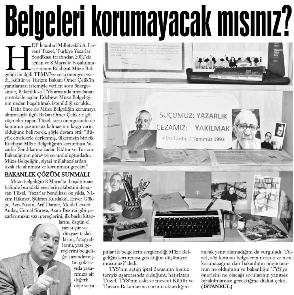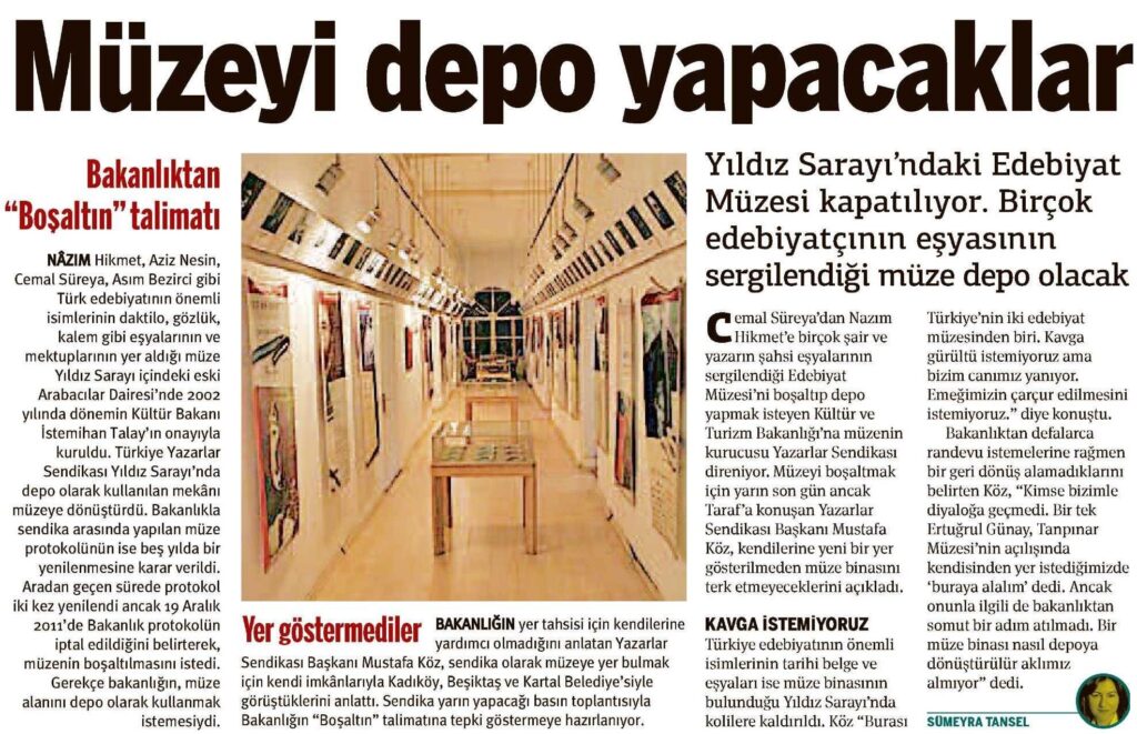 TYS Edebiyat Müzesi ve Belgeliği bir anda yersiz yurtsuz kalıvermişti. Müzedeki tüm malzeme ve arşiv kolilerin içine konup “Edebiyat Müzesi ve Yazın Belgeliği” için yer aranmaya başlandı. Olay basına aksedince bakanlık TYS’ye “müzedeki malzemeleri bize verin, biz koruyalım” teklifini yapmış, bu müzedeki koleksiyonu çeşitli müzelere, kütüphanelere dağıtmayı önermişler. Tabii ki TYS müzeyi dağıtma teklifini kabul etmedi.