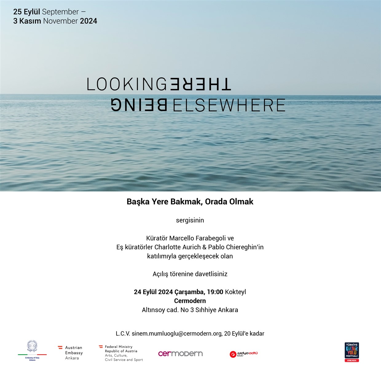Farklı ülkeler arasında hareket halindeki ilişkiler ve aidiyet üzerine kurgulanan, İtalya’nın Ankara Büyükelçiliği tarafından, Avusturya’nın Ankara Büyükelçiliği işbirliğiyle düzenlenen ve Avusturya Sanat, Kültür, Kamu Hizmeti ve Spor Bakanlığı tarafından desteklenen “Başka Bir Yere Bakmak, Orada Olmak” (Looking Elsewhere Being There) sergisi 25 Eylül’de kapılarını açıyor. Marcello Farabegoli Projects ile CerModern işbirliğiyle gerçekleşen karma sergide 30’dan fazla sanatçının eseri yer alacak.