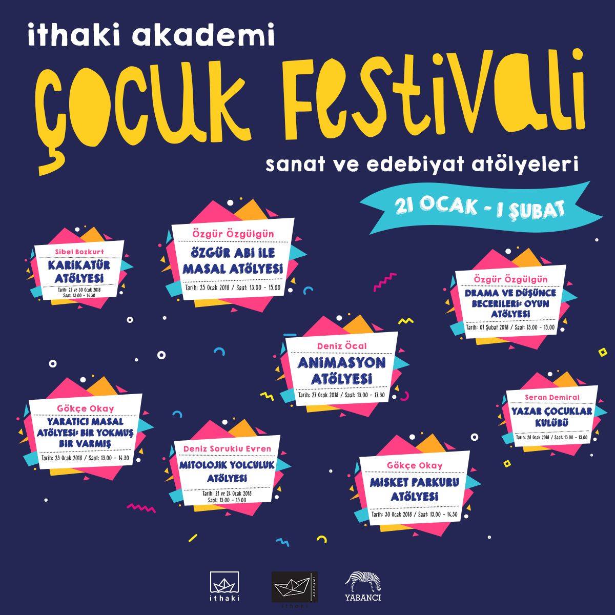 İthaki Akademi’de, İthaki ve Yabancı Yayınları’nın sponsorluğunda bu yıl ilk defa düzenlenecek ve 21 Ocak -1 Şubat 2018 tarihleri arasında gerçekleşecek olan ‘‘Çocuk Festivali’’ sanat ve edebiyat atölyeleri kapsamında 5-12 yaş arası çocuklar için çeşitli etkinlikler sunuyor.