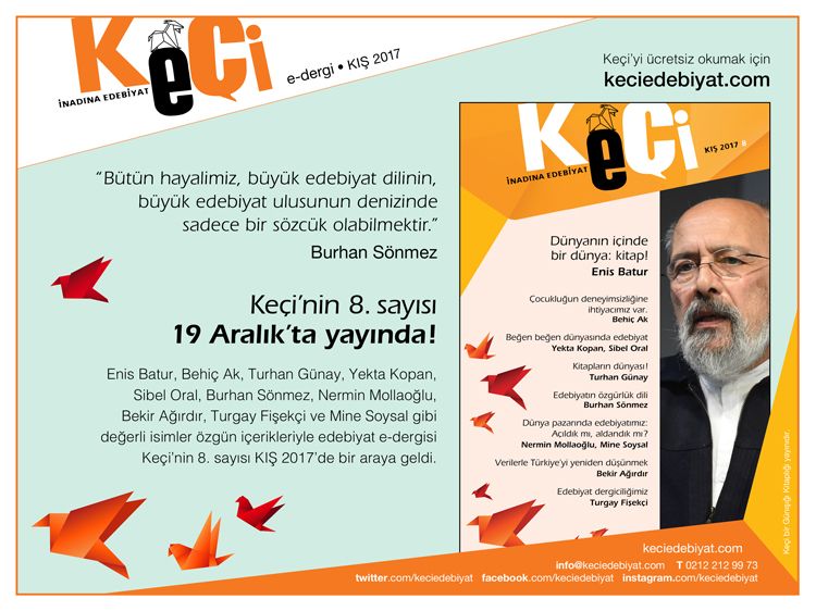 Keçi’nin 8. sayısı 19 Aralık’ta yayında Aralık 12, 2017 yazar admin Keçi dergisinin Kış 2017 sayısı 19 Aralık’ta yayına giriyor. edebiyathaber.net (12 Aralık 2017) İşte, Mayıs 2015'te en çok satan 10 kitap!"Kuçu Kuçu" Afife Jale Sahnesi’ndeMunro, Nobel’i almaya gitmeyecek | Zeynep Heyzen AteşÖykü: Miyav-miyav, mi… | Halil DemirRandevu İstanbul Uluslararası Film Festivali 16 Aralık'ta başlıyorİşte, Sait Faik'in kaleme aldığı birbirinden şahane 17 kitap!