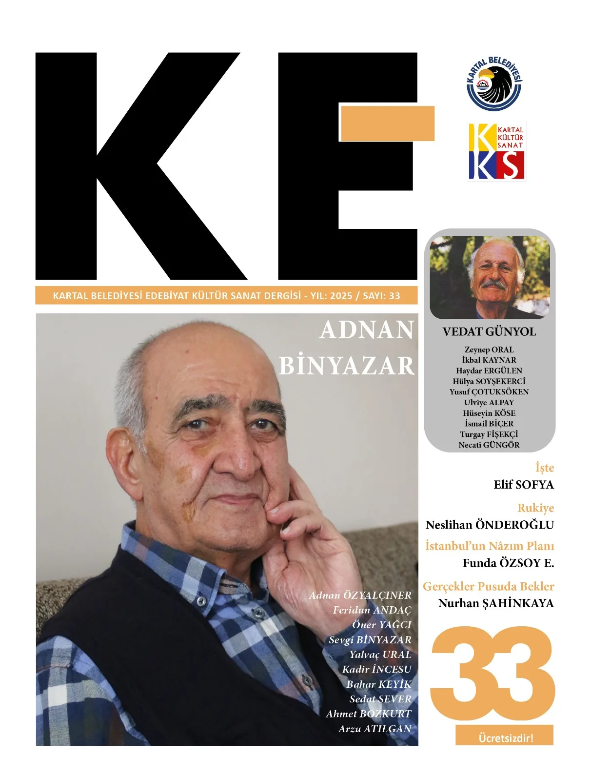 Kartal Belediyesi tarafından iki aylık periyotlarla yayımlanan edebiyat, kültür, sanat dergisi KE’nin 33. sayısı, yazın dünyamızın aydınlanmacı iki ismi Adnan BİNYAZAR ve Vedat GÜNYOL’u ağırlıyor.