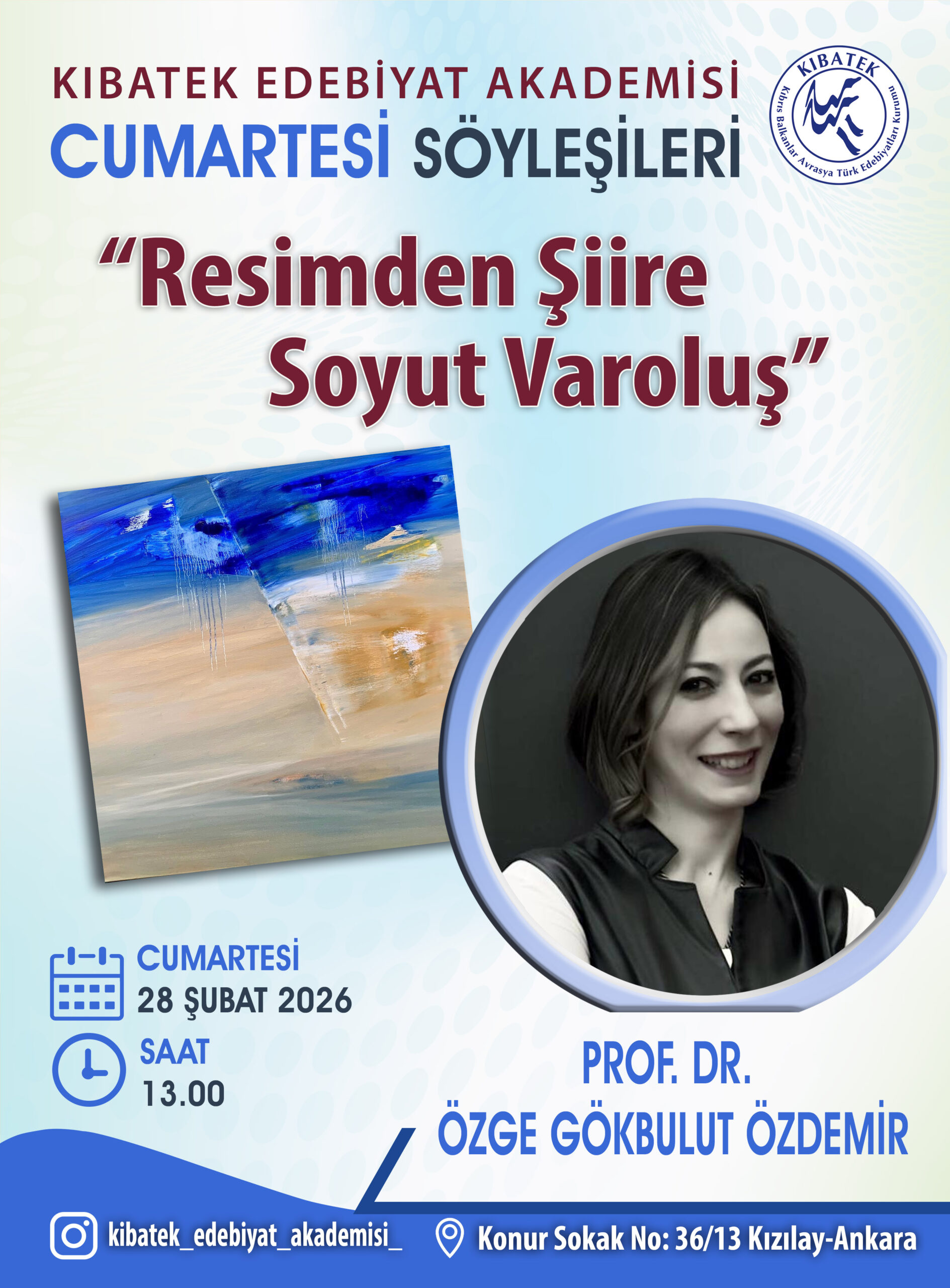 28 Şubat Cumartesi günü KIBATEK Edebiyat Akademisi, sanatın iki özgün ifade alanını aynı düşünsel zeminde buluşturan özel bir etkinliğe ev sahipliği yapacak. “Resimden Şiire Soyut Varoluş” başlıklı söyleşinin konuşmacısı, akademik ve sanatsal çalışmalarıyla dikkat çeken Prof. Dr. Özge Gökbulut Özdemir olacak.