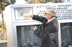 Dün, Dingiloğlu Parkının önüne yerleştirilen dev kumbaraya, Belediye Başkanı Cavit Çağlayan ve belediye personeli kitap ve oyuncak bıraktılar.
