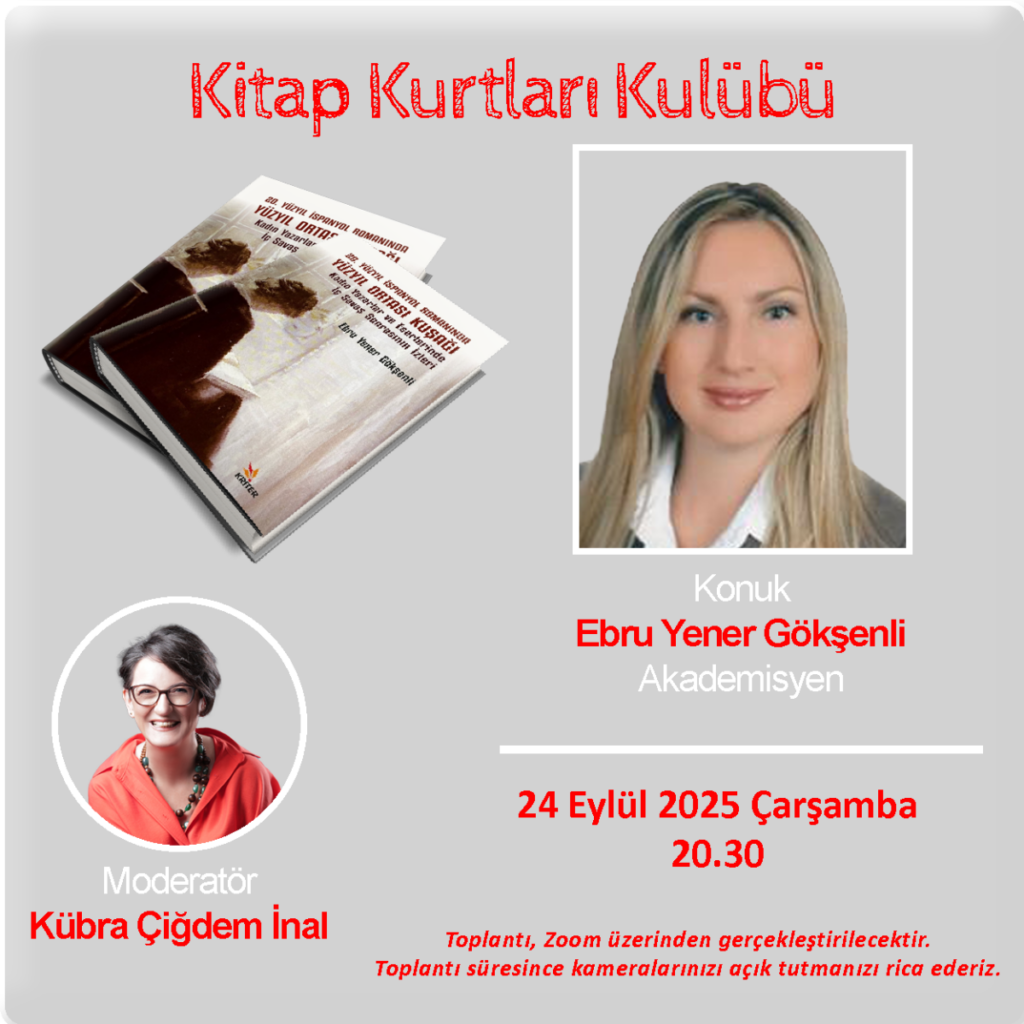Edebiyat tutkunlarını çevrim içi ortamda buluşturan Kitap Kurtları Kulübü, 24 Eylül 2025 Çarşamba günü saat 20.30’da yeni etkinliğiyle okurlarla bir araya geliyor. Bu ayın konuğu, akademisyen Ebru Yener Gökşenli olacak. Moderatörlüğü Kübra Çiğdem İnal’ın üstlenecek.