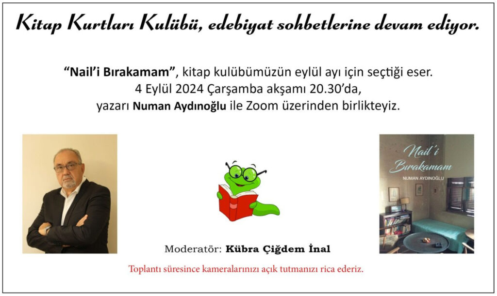 Kitap Kurtları Kulübü, edebiyat sohbetleri serisinin eylül ayı konuğu “Nail’i Bırakamam” ile Numan Aydınoğlu olacak. Etkinlik Kübra Çiğdem İnal moderatörlüğünde 4 Eylül çarşamba günü saat 20.30’da zoom üzerinden. gerçekleşecek.