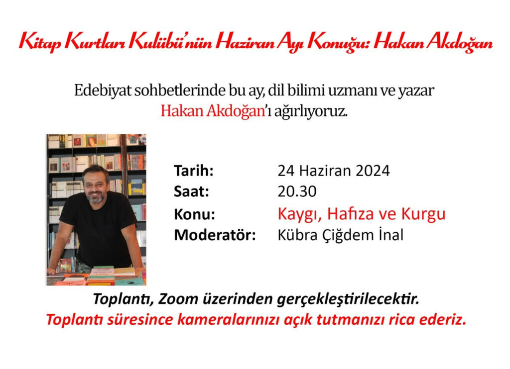 Kitap Kurtları Kulübü’nün her çarşamba düzenlediği etkinlik serisinin haziran ayı konuğu dil bilimi uzmanı ve yazar Hakan Akdoğan olacak. Etkinli 24 Haziran’da saat 20.30’da Zoom üzerinden çevrimiçi olarak düzenlenecek.