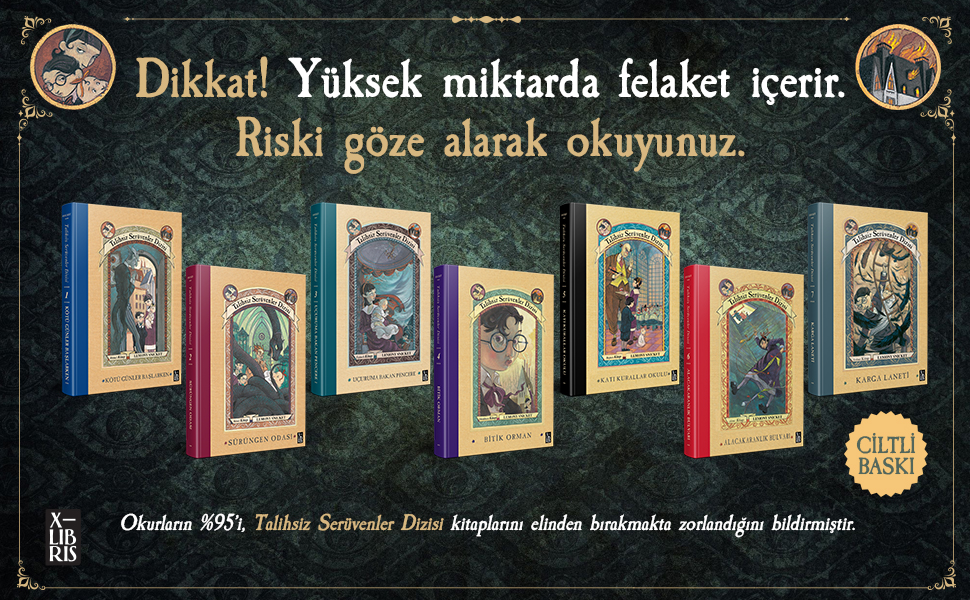 Lemony Snicket tarafından yazılıp Brett Helquist tarafından resimlenen Talihsiz Serüvenler serisinin ilk 7 kitabının ciltli özel baskısı XLibris etiketiyle raflarda.