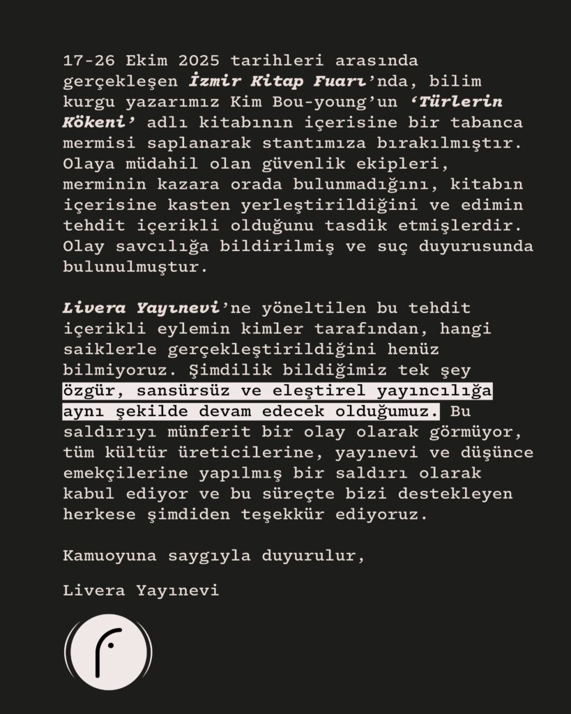Livera Yayınevi’nden İzmir Kitap Fuarı’nda Kim Bo-Young’un Türlerin Kökeni kitabına yapılan saldırıya dair açıklama. Açıklamanın tamamı: