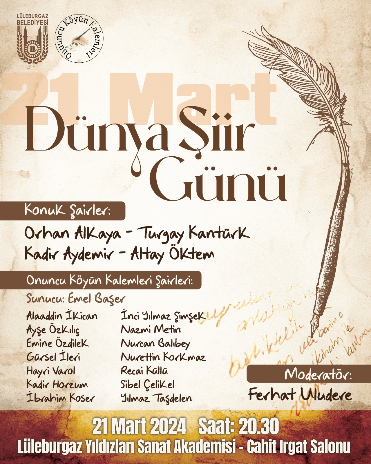 21 Mart dünya şiir günü etkinliği Lüleburgaz Belediyesi desteği ve Onuncu Köyün Kalemleri Platformu üyelerince Lüleburgaz Yıldızlar Sanat Akademisi’nde (LYSA) coşkulu bir etkinlik ile kutlanacak.