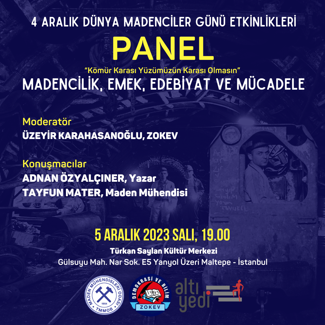 TMMOB Maden Mühendisleri Odası’nın Dünya Madenciler Günü etkinlikleri kapsamında düzenleyeceği, Adnan Özyalçıner ve Tayfun Mater’in konuşmacı olarak katılacağı, Üzeyir Karahasanoğlu ve ZOKEV’in moderasyonu üstleneceği, “Madencilik, Emek, Edebiyat ve Mücadele” paneli 5 Aralık Salı, saat 19.00’da İstanbul, Türkan Saylan Kültür Merkezi’nde gerçekleşecek.