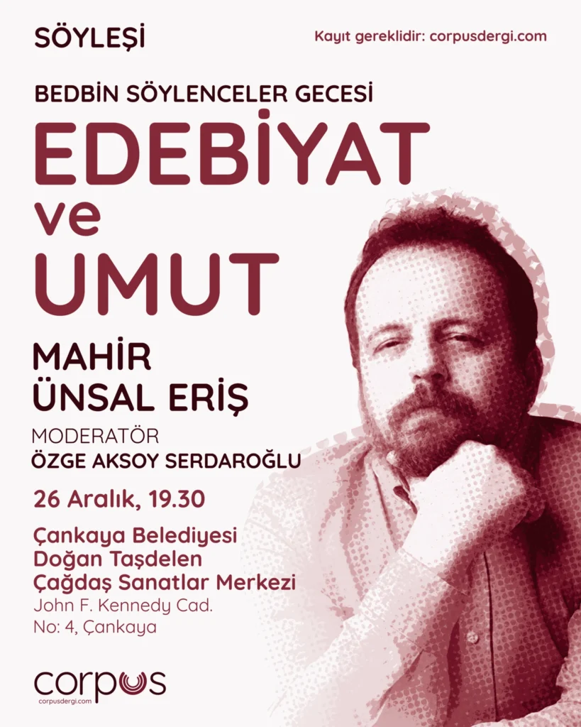 Mahir Ünsal Eriş ile “Bedbin Söylenceler Gecesi: Edebiyat ve Umut” söyleşisi 26 Aralık’ta Aralık 23, 2025 yazar edebiyathaber Corpus Dergi’nin düzenlediği Mahir Ünsal Eriş ile “Bedbin Söylenceler Gecesi: Edebiyat ve Umut” söyleşisi 26 Aralık’ta. 19.30’da başlayacak etkinliğin moderasyonunu Özge Aksoy Serdaroğlu üstlenecek. Türkan İldeniz “50 yıldır suskun” muydu? | Metin Celâlİki kalpli Nida, gitmek ve kalmak | Hatice BalcıMelike Uzun, Reha Çamuroğlu’yla son romanı hakkında konuştuSabahattin Ali bu ormanda yaşayacakHeyt be! Fanzin'in 8. sayısı çıktıEdebî dostluklar, ebedi yabanlıklar | Feridun Andaç