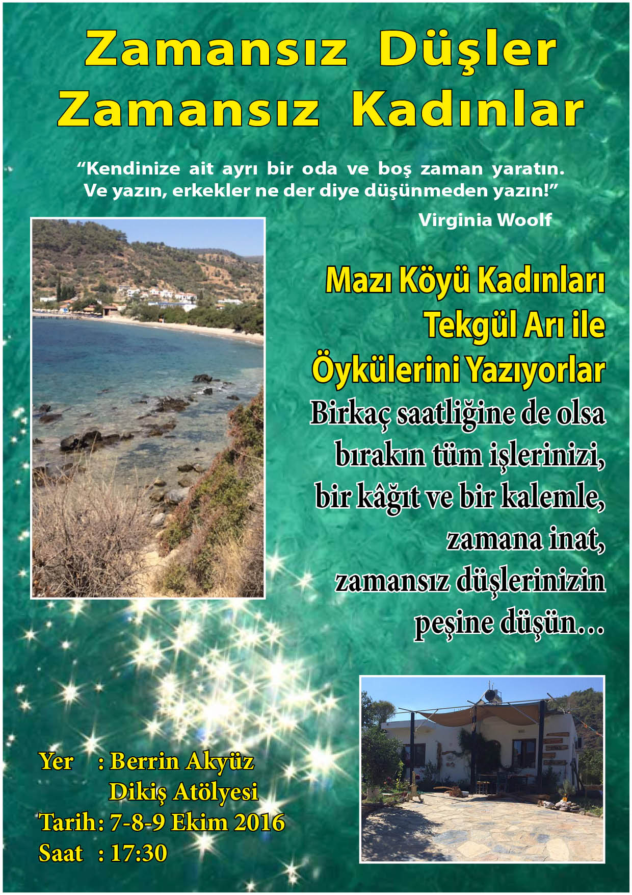 Mazı Köyü kadınları öykülerini yazıyor Eylül 26, 2016 yazar admin Mazı Köyü kadınları, Tekgül Arı ile “Zamansız Düşler Zamansız Kadınlar” atölyesinde 7-9 Ekim tarihleri arasında öykülerini yazacaklar. edebiyathaber.net (26 Eylül 2016) Halikarnas Balıkçısı Bodrum'da anılıyorMurathan Mungan 27 Mayıs'ta okurlarıyla buluşuyorYazı çizi atölyesi perşembe grubu açılıyorİnteraktif etkinlik: "Sessizlikte Diyalog"İstanbul’da Fransız çizgi roman rüzgârları estiİstanbul Uluslararası Edebiyat Festivali 16 yaşında